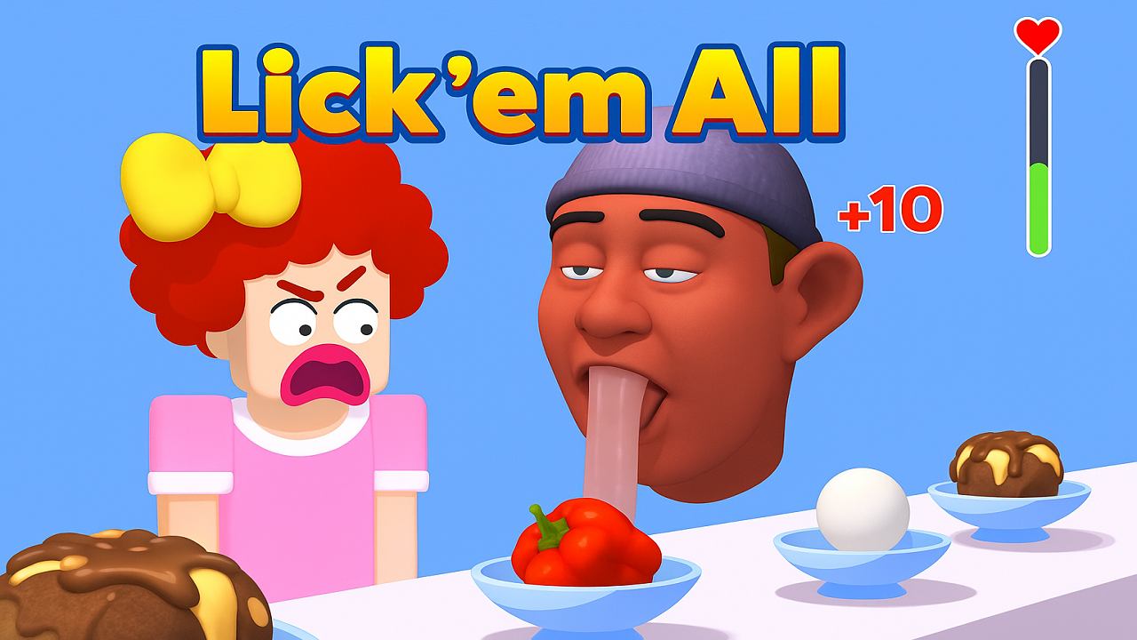In Lick 'em All, you control a head with a strangely long tongue. The task is to lick all the desserts on the table, from cakes to colorful ice cream. But not all are delicious, interspersed with "unpleasant" things such as hot peppers, ice or even dirty things, forcing you to react very quickly to avoid.